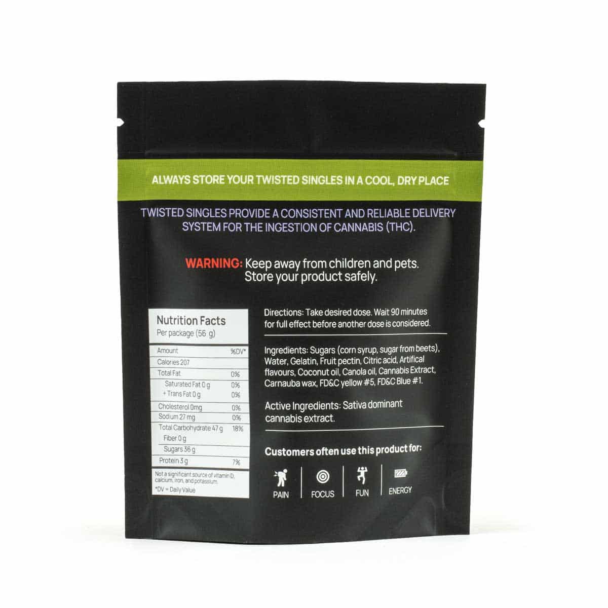 Ingredients: Sugars (corn syrup, sugar from beets), Water, Gelatin, Fruit pectin, Citric acid, Artificial flavours, Coconut oil, Canola oil, Cannabis extract, Carnauba wax, Beeswax, FD&C yellow #5, FD&C blue #1.