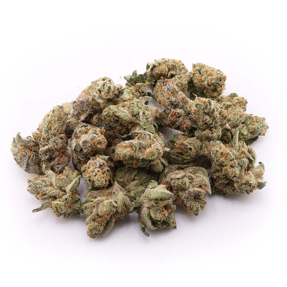 Blue Zushi Smalls is a AAA indica dominant hybrid (60/40) crafted from the flavour-rich pairing of Zkittlez x Kush Mints. With a moderate THC range of 18%–21%, this strain delivers a balanced, terpene-forward experience that leans into calm physical relaxation without overwhelming intensity. The aroma opens herbal and earthy with subtle wood and fresh floral notes, and the buds display light green colouring with dashes of purple and small bright orange hairs throughout.