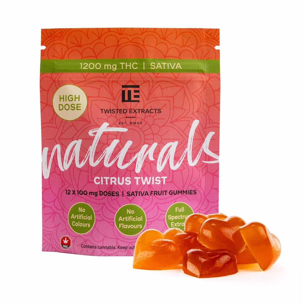 Citrus Twist High Dose Twisted Naturals Gummies are made for experienced edible users who want strong, reliable sativa effects with a clean ingredient profile and vibrant natural flavour. Part of the Twisted Naturals line by Twisted Extracts, these gummies are crafted with all-natural flavours and colours and fully infused with full-spectrum THC oil for consistent, high-potency results.