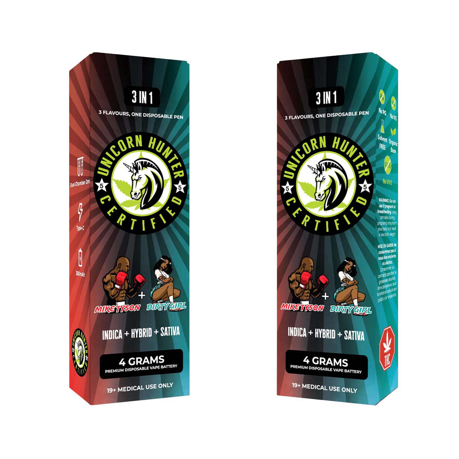 The Unicorn Hunter – 3in1 Disposable Vape Pen – Mike Tyson + Dirty Girl (4 Grams) offers an exceptional, long-lasting vaping experience with Mike Tyson’s potent, heavy hitting relaxation paired with Dirty Girl’s uplifting, citrusy flavors and energizing effects.