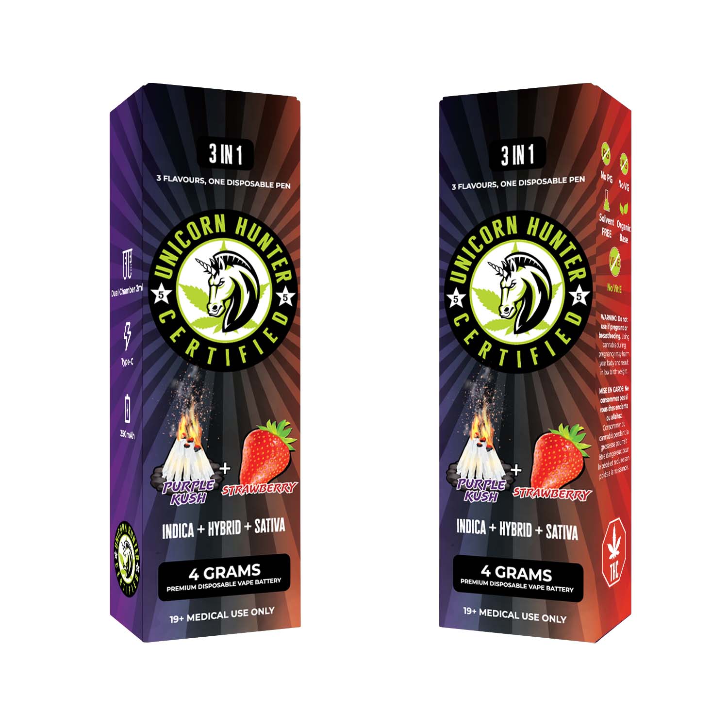 The Unicorn Hunter – 3in1 Disposable Vape Pen – Purple Kush + Strawberry (4 Grams) offers an exceptional, long-lasting vaping experience with Purple Kush’s deeply relaxing, earthy undertones paired with Strawberry invigorating fruity flavours and energizing effects.